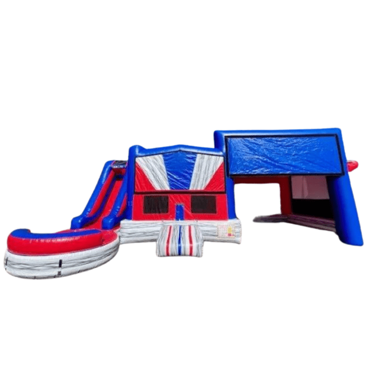1Bring the spirit of competition and excitement to your event with the Patriot Double Lane Combo! This bold and patriotic-themed inflatable is designed for non-stop fun, featuring two exciting slides that let participants race side by side to the bottom. Inside, the action continues with a basketball hoop for some added hoops and a spacious jumping area for endless bouncing.