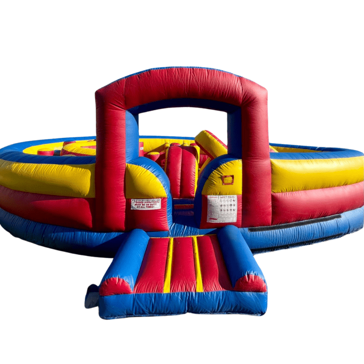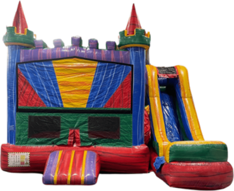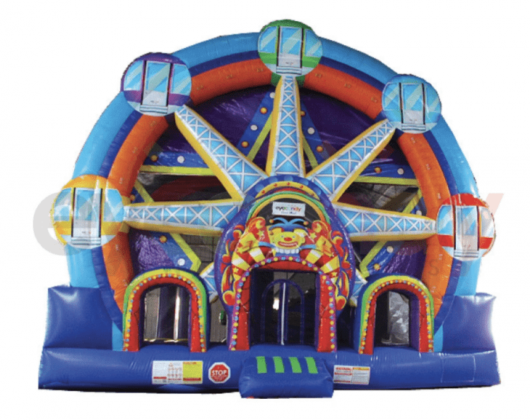 1Bring the magic of the carnival to your event with our Carnival Combo – a bright, colorful inflatable packed with nonstop fun! This all-in-one unit features a huge moonwalk area, crawl-through, climbing obstacle, interior basketball hoop, exterior slide, and even a Twister game mat sewn right into the bounce floor for extra silliness.