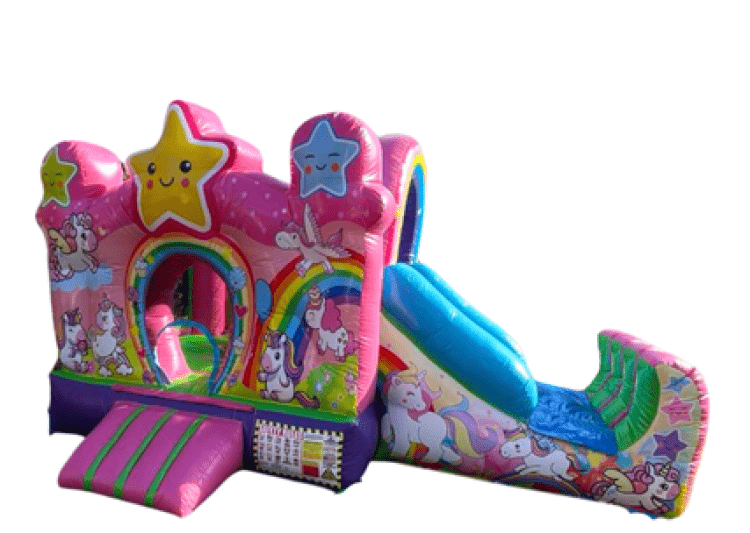 1Step into a world of magic with our Unicorn Combo, a vibrant 5-in-1 inflatable packed with fun for everyone! Featuring 2 basketball hoops (inside & outside), a spacious jump area, a thrilling wall climb, and a tall slide, this unit offers endless entertainment!