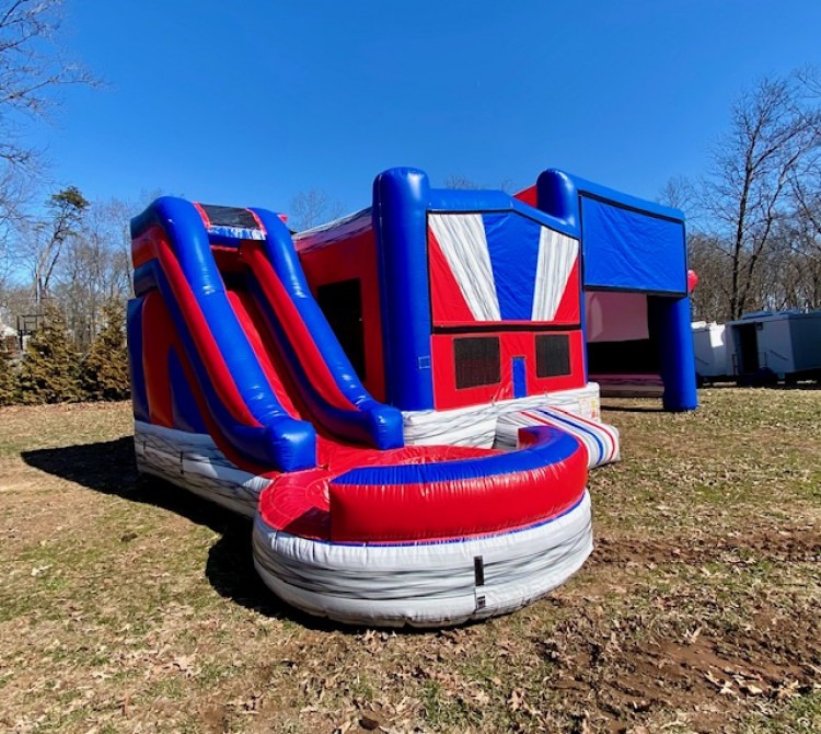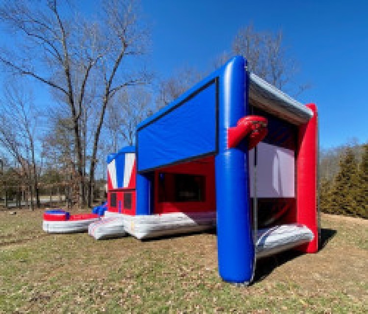 This unit is a 4in1 featuring a ball hoop on the inside of the inflatable as well as on the outside corner of the canopy (Balls not included). The slide can also be used wet or dry with a convertible bumper for a pool in the summer, or you can fill it with balls for a ball pit, and a regular stop bumper if preferred. It has a large open jumper area and climbing wall to the slide. A great all-year-round unit! You can also add a themed banner to dress it up for your occasion! 😀