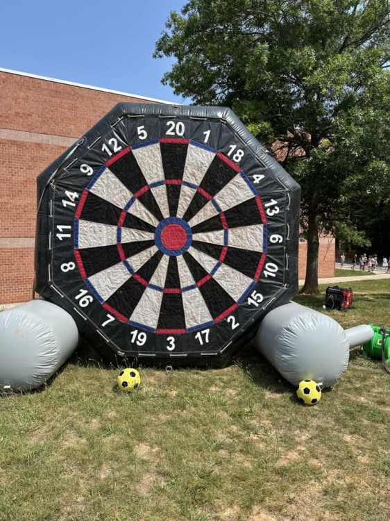 Little athletes will love testing their aim with the Jr. Soccer Dart inflatable game! A fun twist on traditional soccer, kids kick soft balls toward a giant velcro dartboard to rack up points.