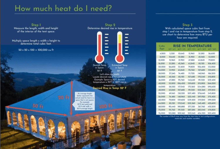 Keep yourself and your guests comfortable with our quiet tent heaters. Create an indoor space out-doors and enjoy your event in comfort.