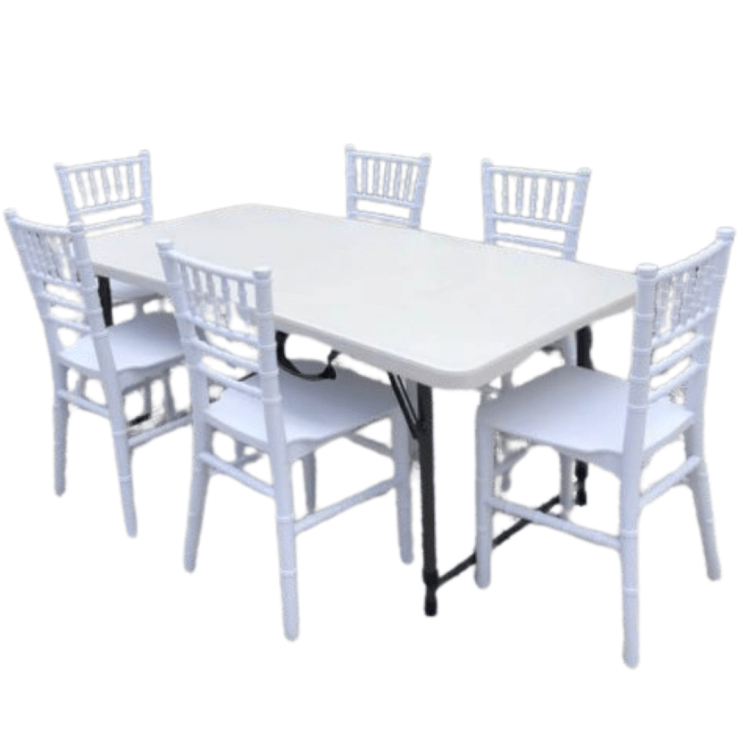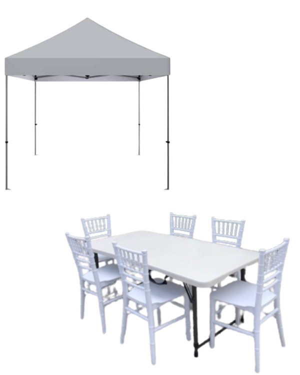 Package includes 1 4' Kids Table, 6 Kids White Chiavari Chairs and 1 10'x10' Tent